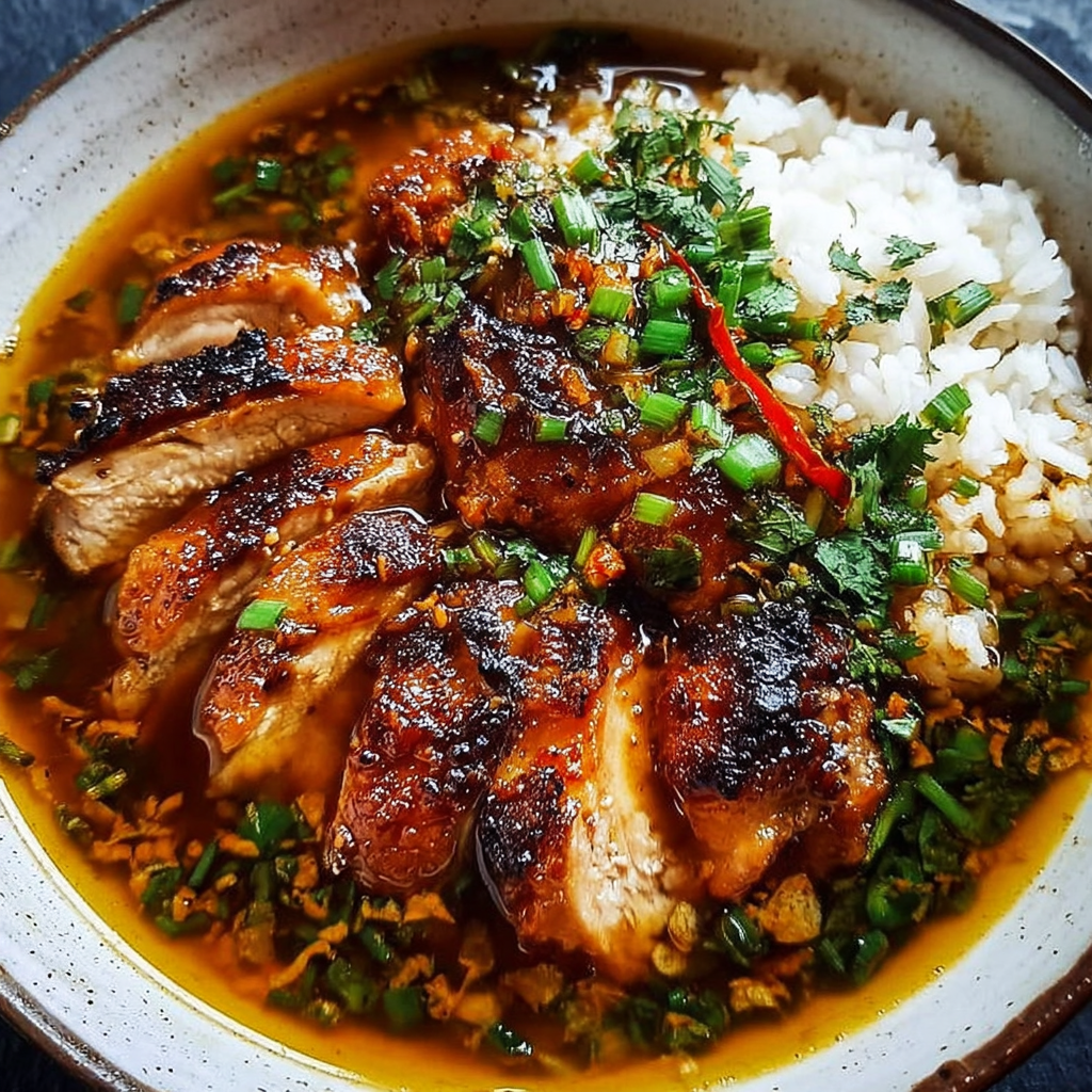 Caramelised Soy Chicken in Garlic Ginger Broth with Rice – Flavor-Packed Dinner Bowl