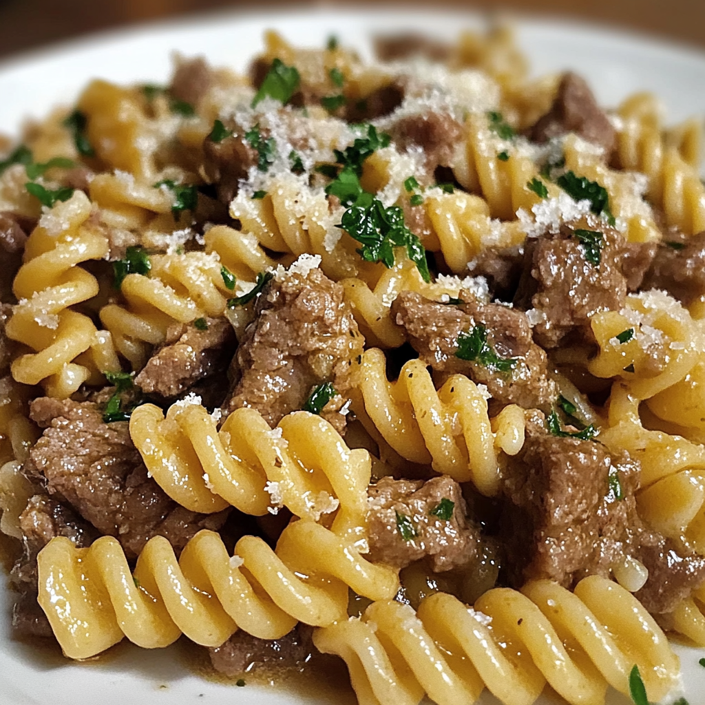 Beef and Rotini in Garlic Parmesan Sauce – Creamy, Savory Weeknight Dinner