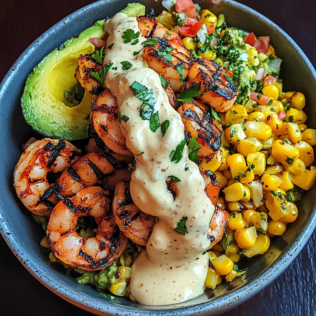 Grilled Shrimp Bowl with Avocado, Corn Salsa & Creamy Sauce – Fresh & Protein-Packed