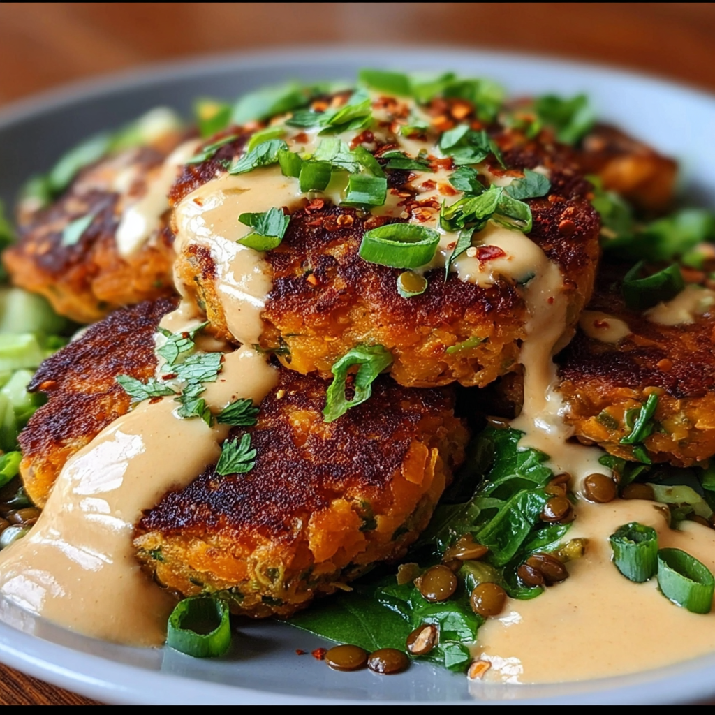 A Delightful Dish: Sweet Potato Patties with Red Lentils & Tangy Tahini Dressing